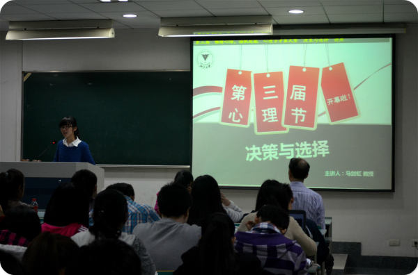 活动尚未开始,现场便已座无虚席。在主持人简单而富有感染力的开场以及对心理节后续系列活动进行介绍及预告后,心理系副系主任马剑虹教授给大家带来的“决策与选择”讲座随即开始。