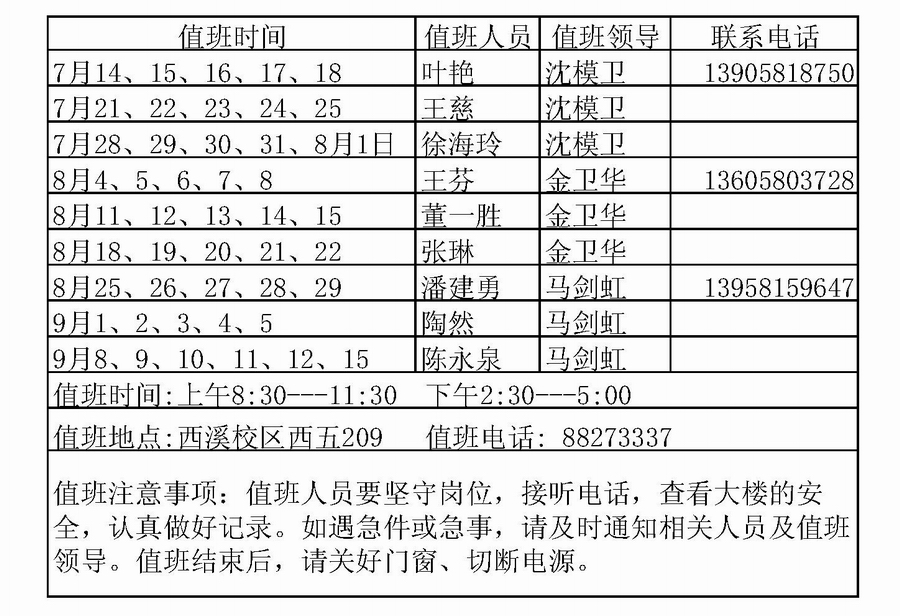 心理与行为科学系2014年暑期值班安排