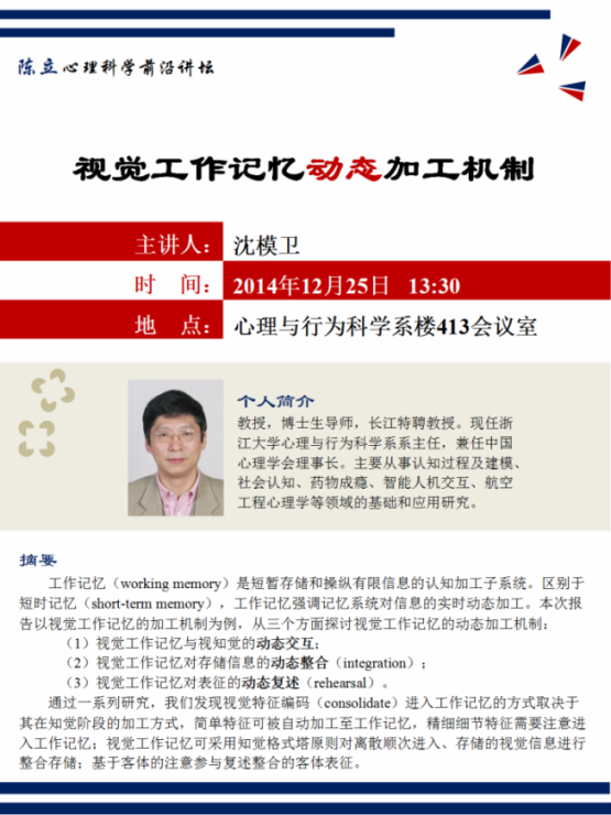 【学术讲座】陈立心理科学前沿讲坛:沈模卫《视觉工作记忆动态加工机制》