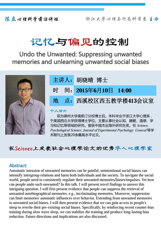 【学术讲座】陈立心理科学前沿讲坛:胡晓晴《记忆与偏见的控制》