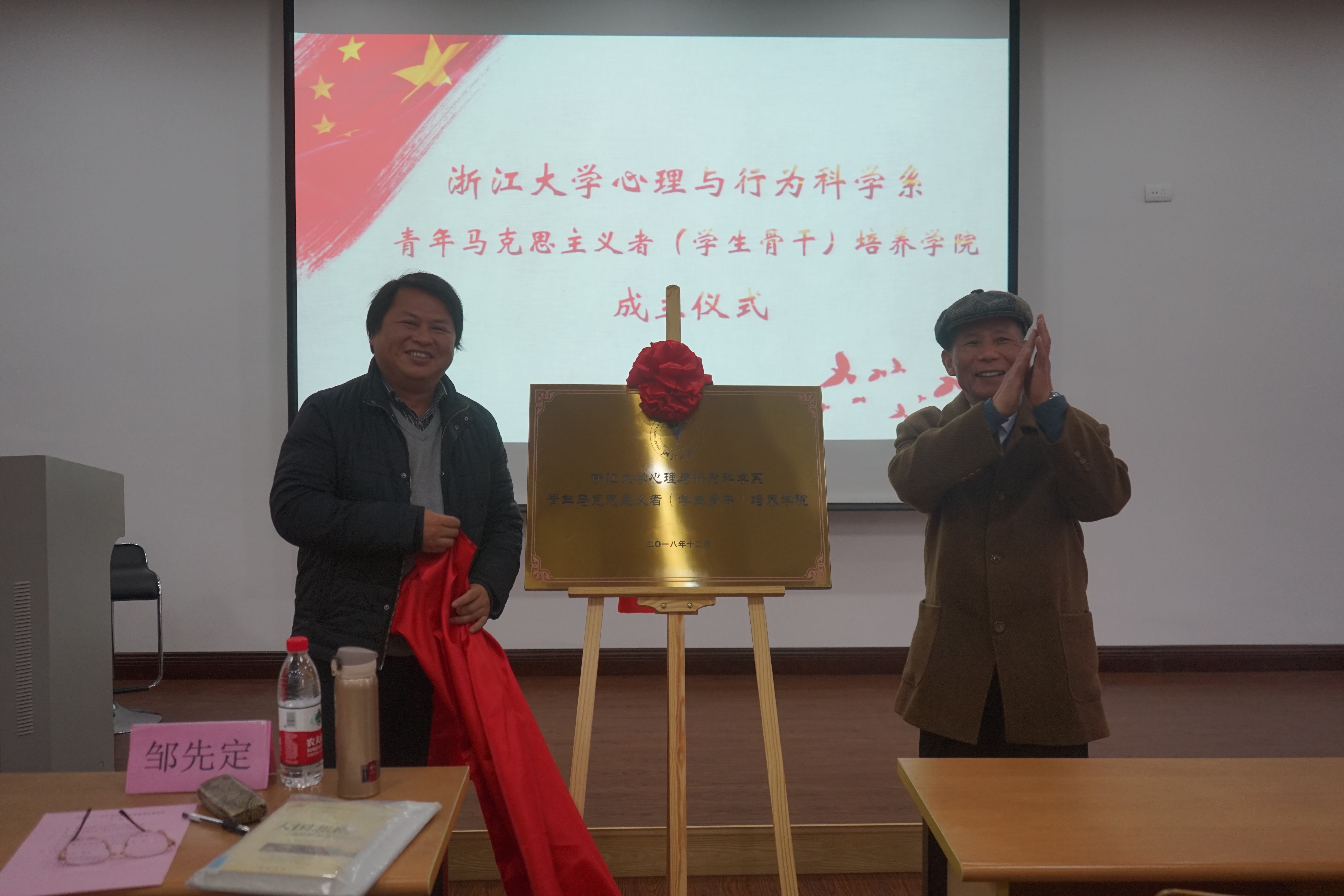 随后,由邹先定老师和林伟连老师一同为浙江大学心理与行为科学系青年马克思主义者(学生骨干)培养学院揭牌,标志着浙江大学心理与行为科学系青年马克思主义者(学生骨干)培养学院正式成立。这是一份信任,也是一份期望。希望同学们能通过青马学院努力能为理论学习的先行者、终身学习的实践者和自主学习的促进者,担民族之希望,强国家之脊梁,拓青春之前路,开盛世之篇章。
