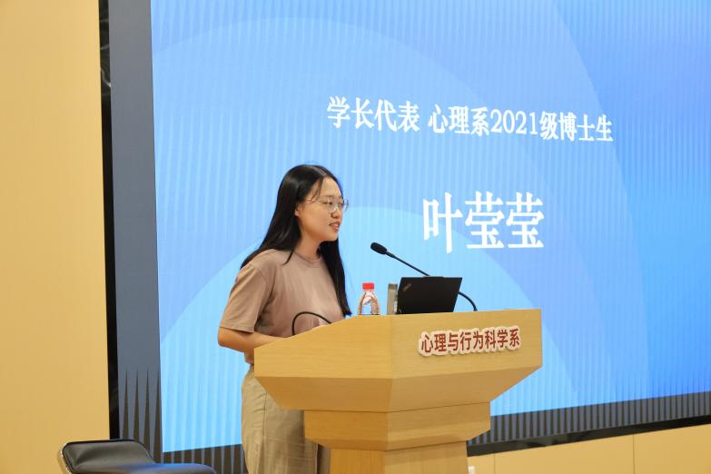 2021级直博生叶莹莹作为学长代表发言。她结合自身科研与访学经历,鼓励新生不忘初心、脚踏实地、心怀天下,在科研道路上保持热情、坚持深耕,并积极将所学回馈社会,做有温度、有担当的心理学人。