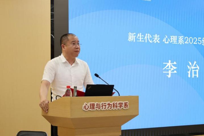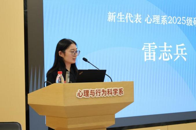 2025级全日制硕士生雷志兵和非全日制博士生李治作为新生代表先后发言。雷志兵回顾了本科阶段在心理系的成长与收获,倡议同学们夯实基础、不惧挑战、心怀善意,共同建设温暖向上的学系氛围。李治分享了自己从企业重返校园的心路历程,表达了对系统学习心理学、促进理论与实践融合的期待,期待真正实现学以致用,在多元碰撞中共同成长。
