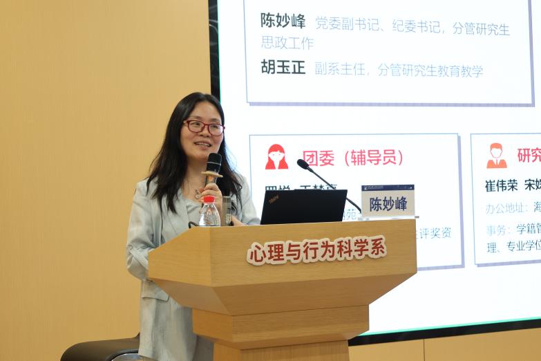 在第二阶段始业教育报告会上,陈妙峰为研究生新生带来《心理系卓越研究生成长规范》专题分享。她鼓励同学们树立远大理想,以追求卓越为目标,主动思考自我成长方向,尽早确立研究生阶段的发展规划,善用学校和院系提供的各类资源,成长为心怀“国之大者”,葆有人文关怀,秉持“科学家”精神,有担当、善创新、有作为的卓越心理学人才。