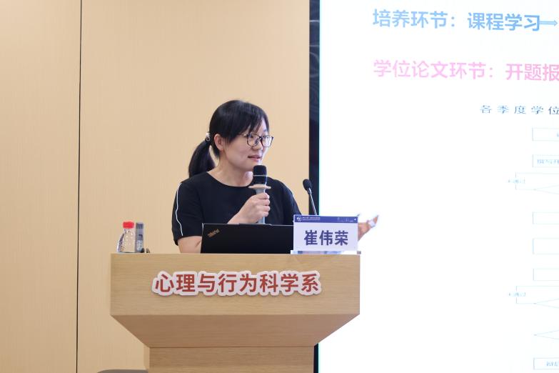 心理系研究生秘书崔伟荣老师详细介绍了心理系研究生的培养环节与流程,帮助同学们进一步明确研究生阶段的任务与要求,并勉励同学们努力成为意志坚定、积极向上的新时代青年。