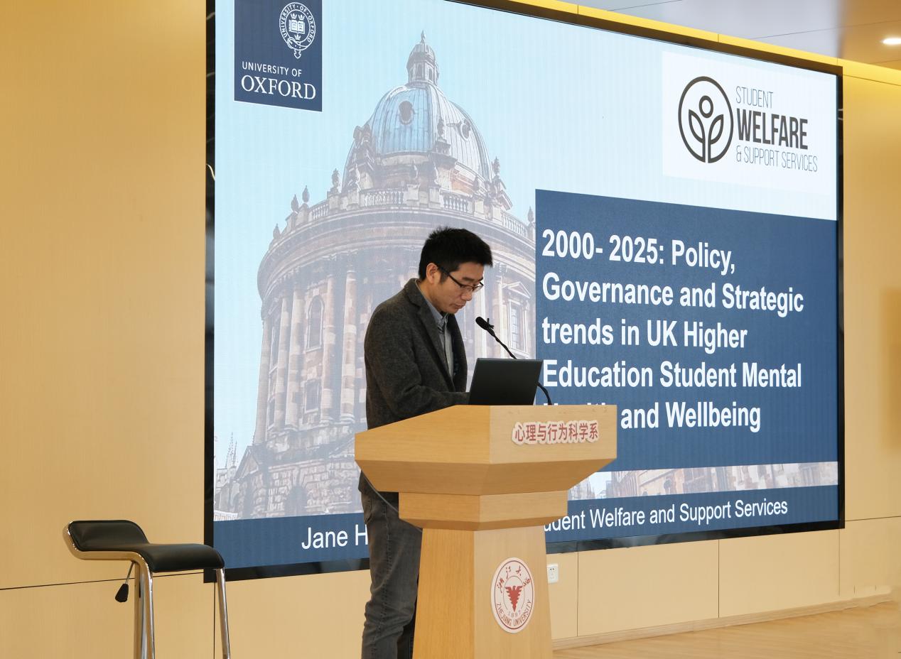 2025年10月22日上午,由浙江大学心理与行为科学系与中国心理卫生协会共同主办的陈立心理科学前沿论坛暨中国心理卫生协会青年系列研讨活动在浙江大学紫金港校区顺利举行。本次论坛特邀牛津大学学生福利与支持服务联合主任、心理咨询中心主任简·哈里斯(Jane Harris)老师担任主讲人,围绕“国际视角下大学生心理健康的现状及挑战”展开深入探讨。中国心理卫生协会副秘书长王倩老师,浙江大学心理与行为科学系副系主任胡玉正老师、百人计划研究员吕韵老师、副教授杨宏飞老师及讲师徐青老师等专家、学者出席活动。