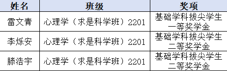 根据《基础学科拔尖学生培养试验计划实施办法》(教高司函〔2012〕2号)等文件要求,经同学自主申报、心理系奖学金评审委员会评议,现将心理系2024-2025学年基础学科拔尖学生奖学金名单公示如下: