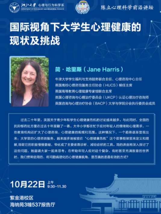 In the past two decades, discussions about the mental health crisis among adolescents and students in the UK have become increasingly common. At the same time, the national prescription rate for antidepressants has doubled over the past ten years. Schools and universities are busy addressing the emotional and psychological needs of young people, with some educational institutions expanding the scale and scope of psychological counseling and mental health services. In this context, a trend has gradually emerged: university counseling services are increasingly being defined and understood within the narrative framework of the mental health crisis, leading to a gradual narrowing of their functions, reducing them to tools primarily reliant on diagnosis and symptom alleviation. Jane's lecture will delve into these issues, and she invites everyone to consider: when helping young people navigate this complex and sometimes hostile world, is the mental health perspective that often pathologizes problems truly the most effective approach?