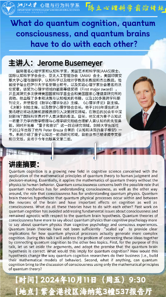 Jerome Busemeyer is an internationally renowned psychologist and cognitive scientist. He is a Fellow of the American Academy of Arts and Sciences (AAAS), the International Society for Cognitive Science, and the Asia-Pacific Artificial Intelligence Association (AAIA). He serves as a Professor and Distinguished Professor in the Department of Psychological and Brain Sciences at Indiana University, USA, and holds an honorary doctorate from the University of Basel, Switzerland. He is a recipient of the prestigious Warren Medal, the highest-level award in the field of psychology. His research has been consistently funded by the U.S. National Science Foundation and the National Institute of Mental Health. Professor Busemeyer has authored or co-authored numerous books and over 100 interdisciplinary journal articles on cognition and decision-making. He has served as Editor-in-Chief of the Journal of Mathematical Psychology, Associate Editor of Psychological Review, Founding Editor of Decision, and President of the Society for Mathematical Psychology. His 1993 work on Decision Field Theory profoundly shaped the international scientific community's understanding of human decision-making over the subsequent three decades. Currently, he is a pioneer in Quantum Cognition—an interdisciplinary field applying the mathematical principles of quantum mechanics to psychological research—and is also exploring the frontier of Quantum and Consciousness. Cambridge University Press published his co-authored book with Peter Bruza, Quantum Models of Cognition and Decision, in 2012, which systematically introduces this cutting-edge field. The book has been translated into Chinese and Japanese, with a second English edition forthcoming this year.