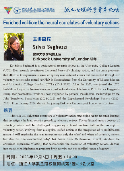 Dr. Silvia Seghezzi is a postdoctoral research fellow at University College London (UCL). Her research investigates the neural bases of voluntary action and the brain processes that allow us to experience a sense of agency over external events that we control through our voluntary actions. She earned her PhD in Neuroscience from the University of Milano-Bicocca and University College London (UCL) (2018-2021). After completing her PhD, she joined the UCL Institute of Cognitive Neuroscience as a postdoctoral research fellow in Prof. Patrick Haggard's group. Her postdoctoral work has been supported by personal Postdoctoral Fellowships from the John Templeton Foundation (2021-2022) and the Experimental Psychology Society (2022-2023). From January 2024, she will be joining Birkbeck University of London as a Lecturer.