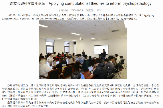 On the afternoon of December 19, 2023, Assistant Professor Jingwen Jin from the Department of Psychology at The University of Hong Kong was invited to the Chen Li Young Scholars in Psychological Science Forum hosted by the Department of Psychology and Behavioral Science at Zhejiang University. She delivered an academic report titled Applying Computational Theories to Inform Psychopathology. The event attracted numerous faculty and students, resulting in a full house.