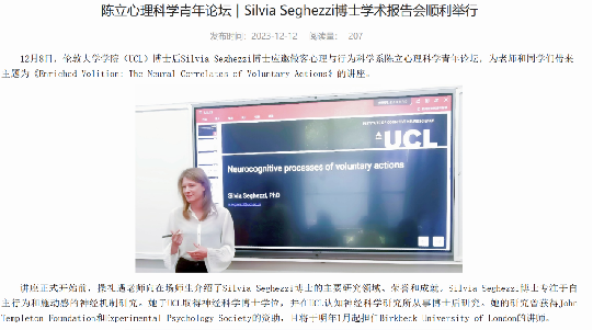 On December 8th, Dr. Silvia Seghezzi, a postdoctoral researcher at University College London (UCL), was invited to the Chen Li Young Scholars in Psychological Science Forum hosted by the Department of Psychology and Behavioral Science. She delivered a lecture titled Enriched Volition: The Neural Correlates of Voluntary Actions for faculty and students.