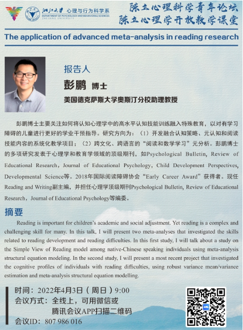 Dr. Peng Peng focuses on integrating high-level cognitive skills training from cognitive psychology into special education to provide better academic intervention guidance for children with learning disabilities. His research directions include: (1) developing systematic instructional programs that integrate cognitive strategies, metacognition, and reading skills; (2) cross-cultural and cross-linguistic meta-analyses on reading and mathematical learning. Dr. Peng Peng has published multiple studies in top-tier psychology and education journals, such as Psychological Bulletin, Review of Educational Research, Journal of Educational Psychology, Child Development Perspectives, and Developmental Science. He was the recipient of the 2018 International Dyslexia Association Early Career Award. He currently serves as Associate Editor of Reading and Writing and is an editorial board member for top psychology journals, including Psychological Bulletin, Review of Educational Research, and Journal of Educational Psychology.